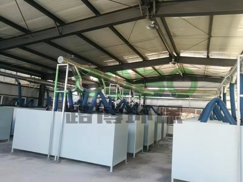 實(shí)訓(xùn)室排煙系統(tǒng)現(xiàn)場(chǎng)所需除塵的工位共包含20個(gè)焊接工位,每個(gè)工位煙塵收集采用一套2.5m長萬向吸氣臂的形式。吸氣臂規(guī)格:φ150mm*2500mm每條支管道配套一個(gè)手動(dòng)風(fēng)閥;