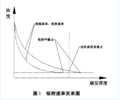 同樣的條件下,一般活性炭層的厚度越厚,其去除效率也會越高,但實際應(yīng)用中,為提高設(shè)備的經(jīng)濟(jì)性,通常要考慮碳層厚度不能無限制的加厚,因此對于活性炭層厚度的選擇,需要根據(jù)去除效率要求和碳本身的吸附速率,進(jìn)行有效設(shè)計計算。通過圖1可以看出,(1)碳層厚度選擇小,吸附速率慢,碳層就會容易被穿透,導(dǎo)致去除效率降低;(2)碳層厚度選擇大,吸附速率快,碳層就不容易被穿透,碳可以長時間使用。
