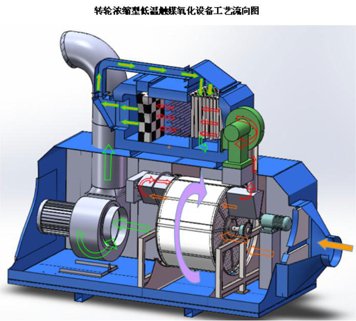 轉(zhuǎn)輪濃縮型低溫觸媒氧化設(shè)備:是采用轉(zhuǎn)輪式吸附床對有機廢氣進(jìn)行吸附濃縮,濃縮的有機廢氣在脫附再生區(qū)被脫附后,被再生風(fēng)機引入催化燃燒凈化裝置,進(jìn)一步凈化處理。整個裝置分為VOC濃縮區(qū)和濃縮后VOC凈化處理區(qū)兩大模塊。